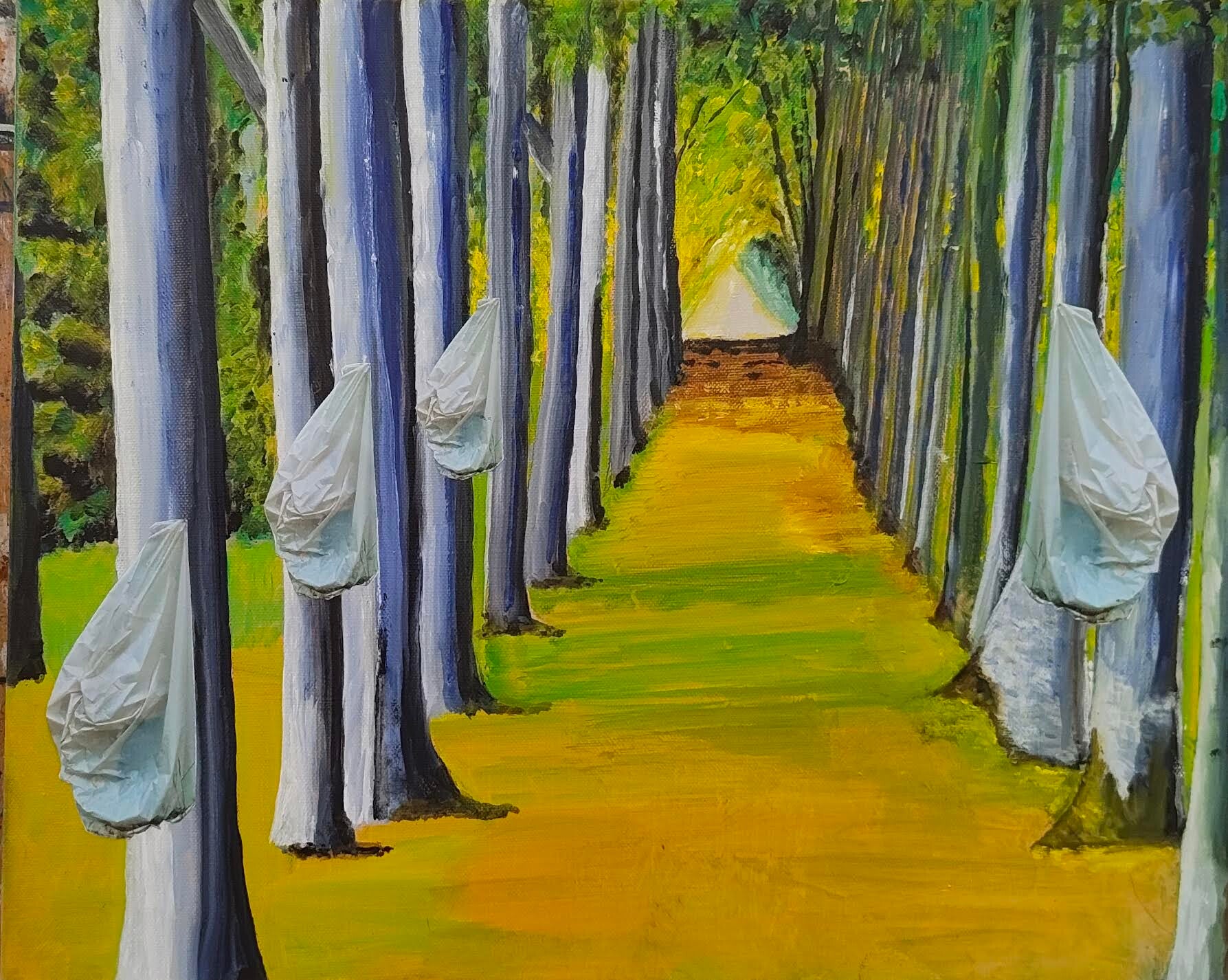 Olieverf op doek, 40 x 50 cm, geen kader, titel: afvalzakken (2)